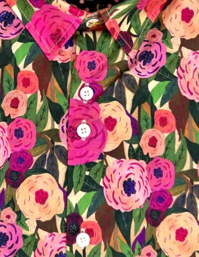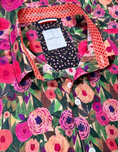 Une chemise avec imprimé floral rose et vert sur fond beige, pensée pour un style affirmé et lumineux.