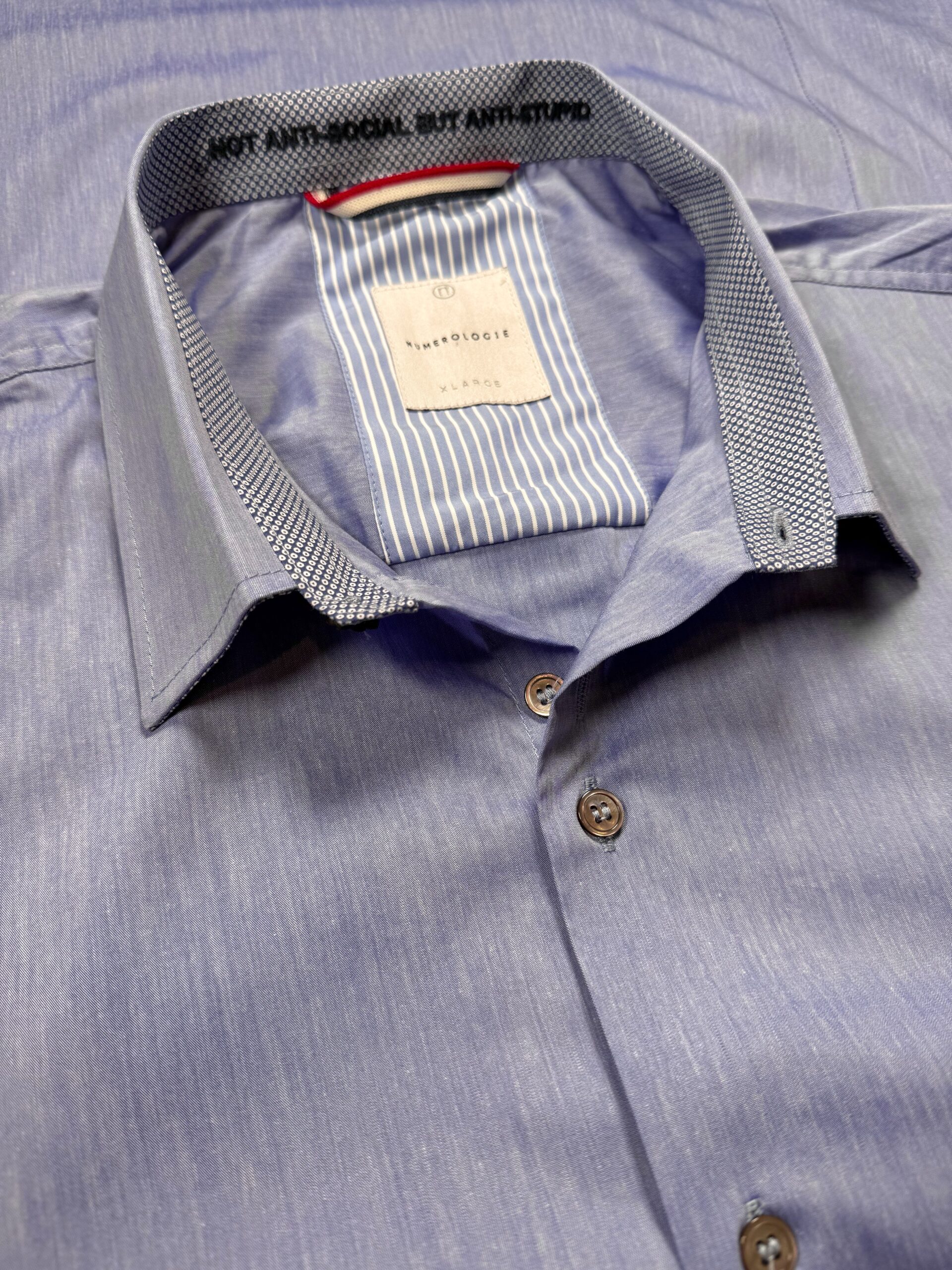 Chemise bleue unie – coton doux, broderie marine « NOT ANTI-SOCIAL BUT ANTI-STUPID », coupe ajustée. Numérotation unique.