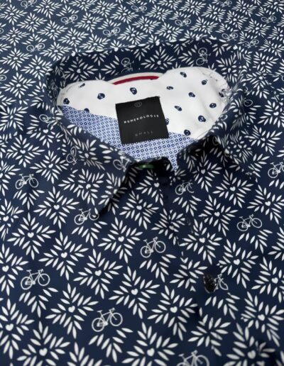 Chemise à motif graphique écru sur fond marine – coton doux, coupe ajustée. Numérotation unique