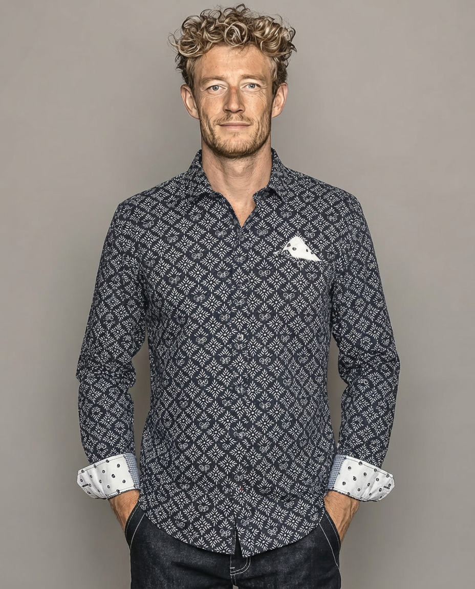 Une chemise à motif graphique écru sur fond marine, pensée pour un style qui allie confort et sophistication.