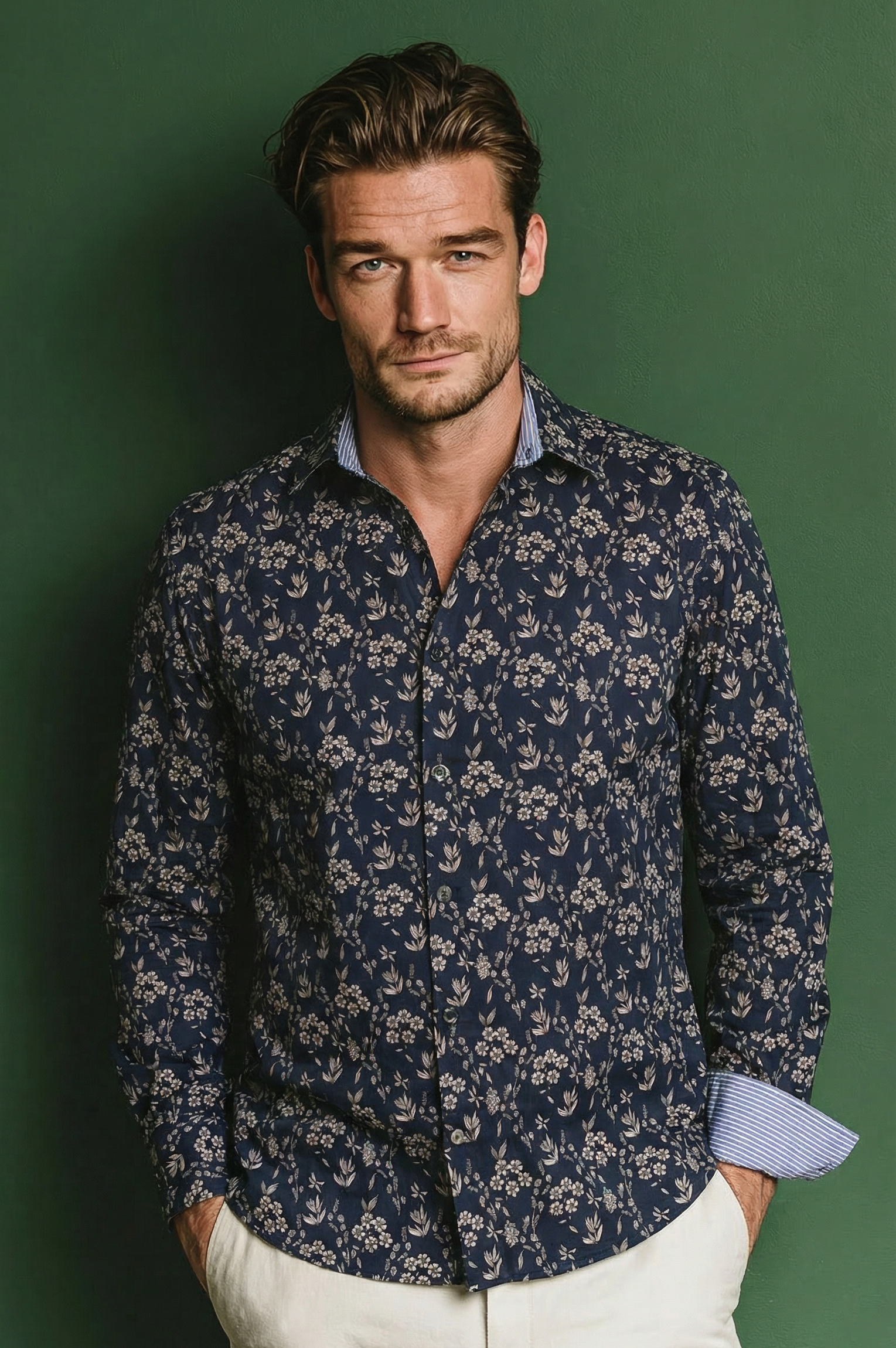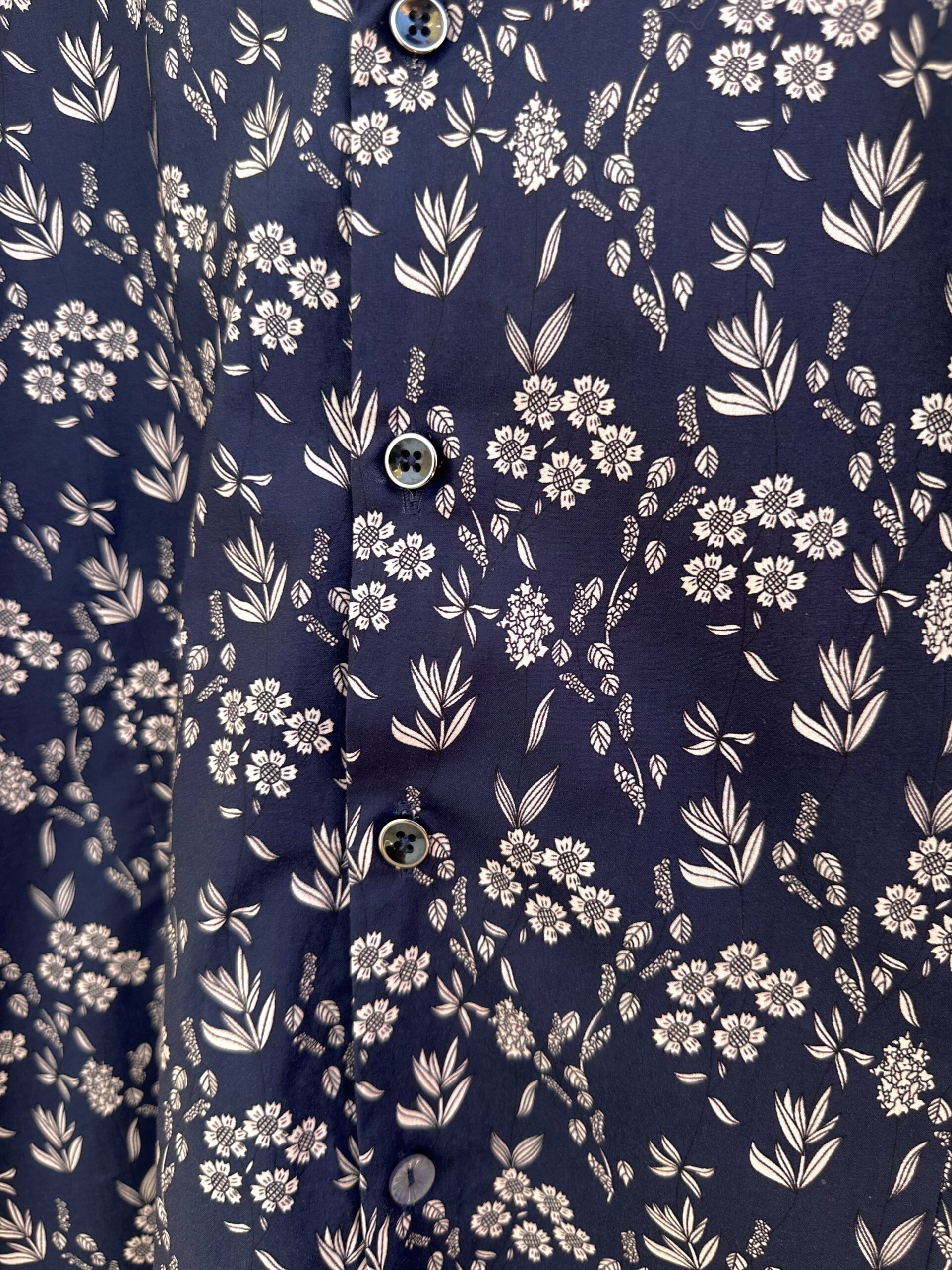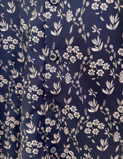 Une chemise à motif floral beige sur fond marine, pensée pour un style qui allie confort et sophistication.