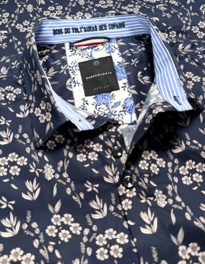 Chemise à motif floral beige sur fond marine – coton doux, broderie marine  » Bois du vin, t’auras des copains « , coupe ajustée. Numérotation unique