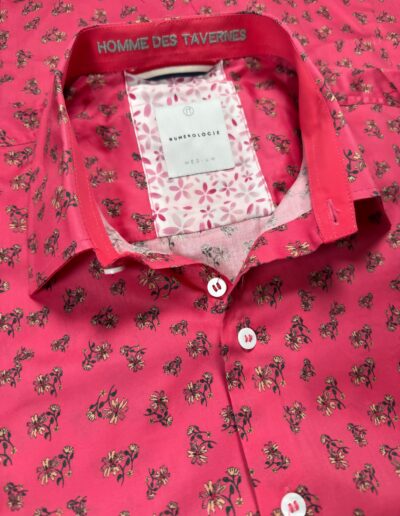 Chemise à motif floral sur fond rose fuchsia– coton doux, broderie grise  » HOMME DES TAVERNES « , coupe ajustée. Numérotation unique