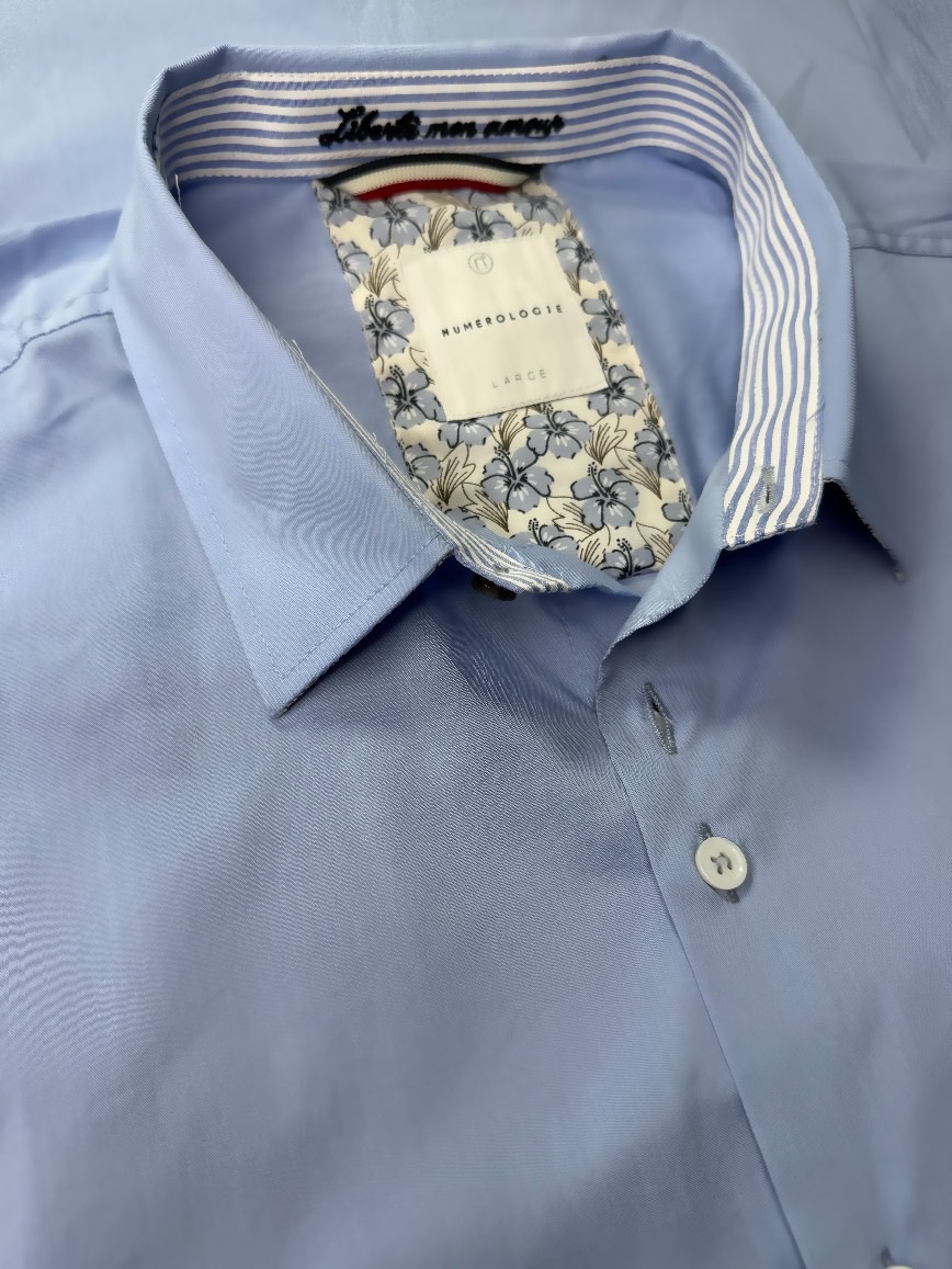 Chemise ciel unie – coton doux, broderie marine « Liberté mon amour », coupe ajustée. Numérotation unique.