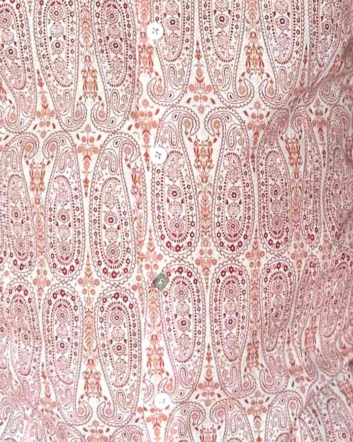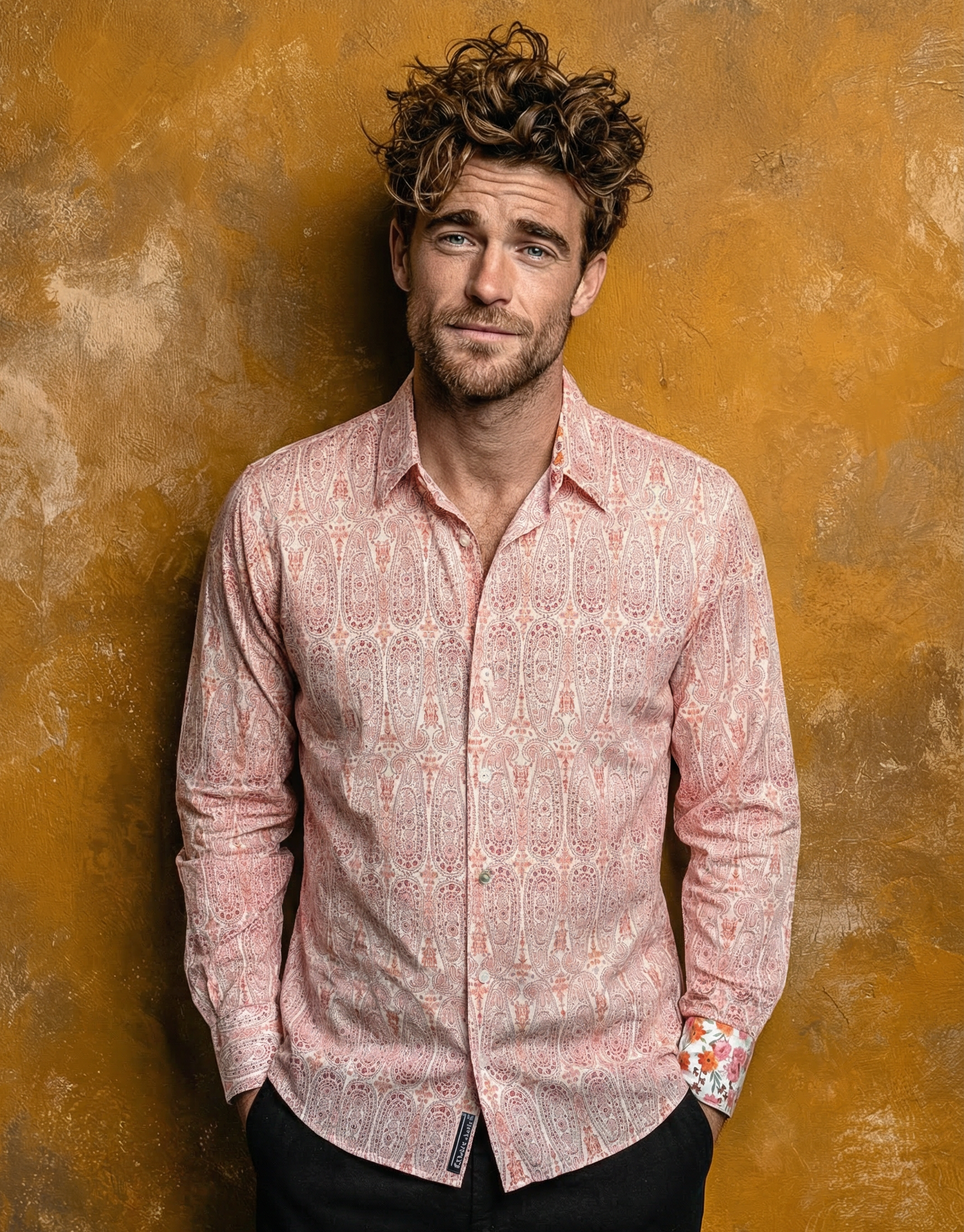 Une chemise à motif cachemire orange sur fond écru, pensée pour un style qui allie confort et sophistication.