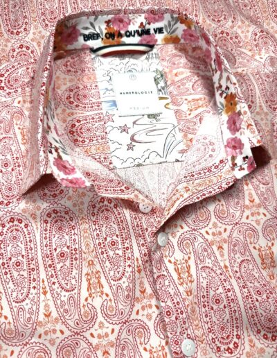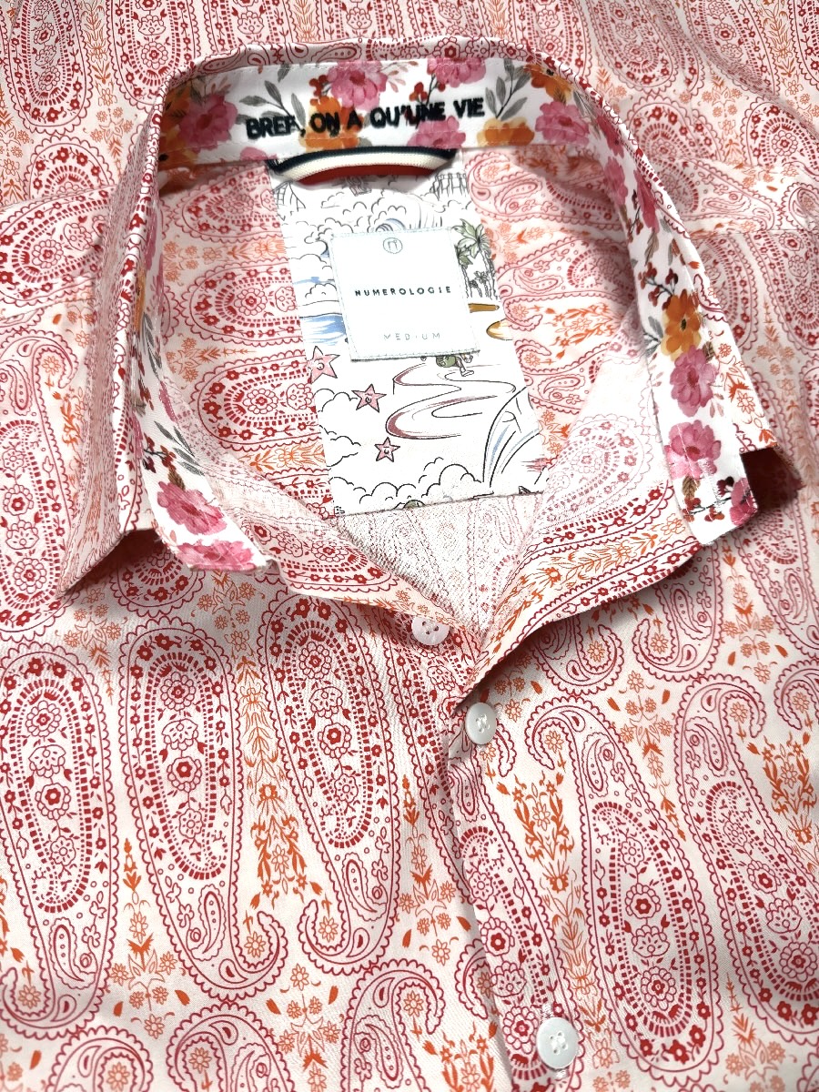 Chemise à motif cachemire orange sur fond écru – coton doux, broderie marine « Bref, on a qu’une vie », coupe ajustée. Numérotation unique