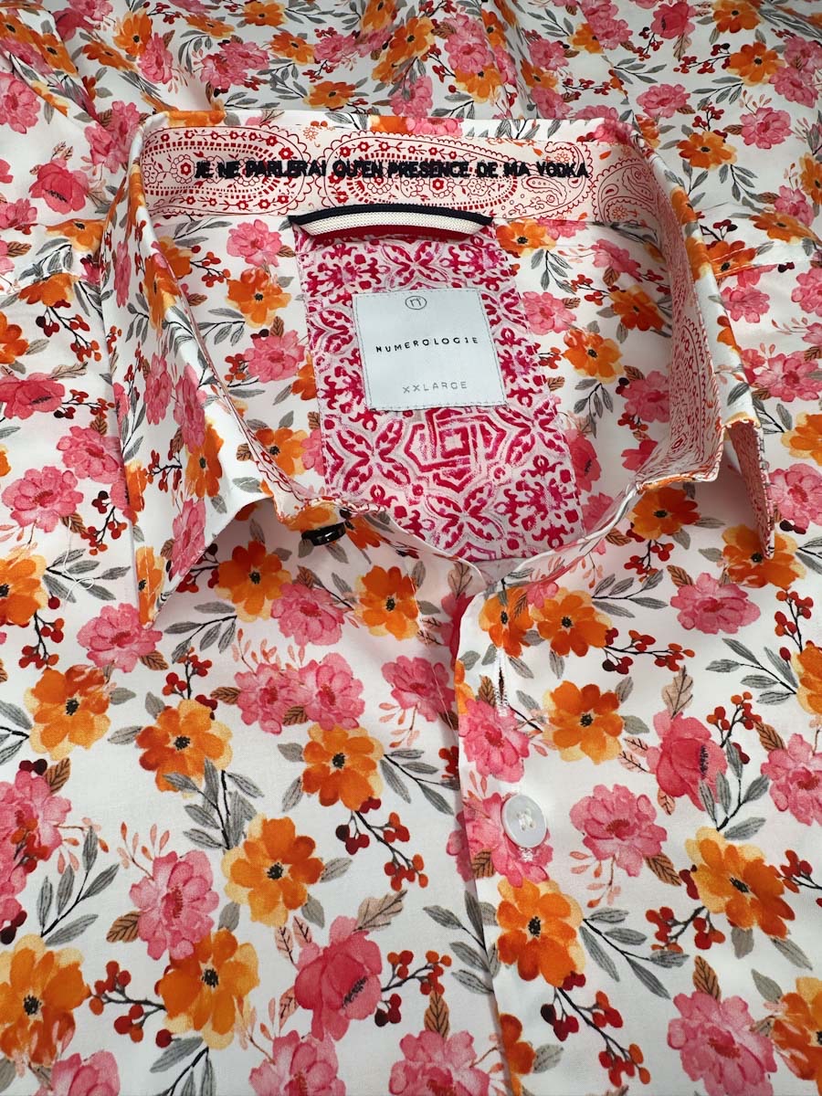 Une chemise à motif floral rose et orange sur fond écru, pensée pour un style qui allie confort et sophistication.