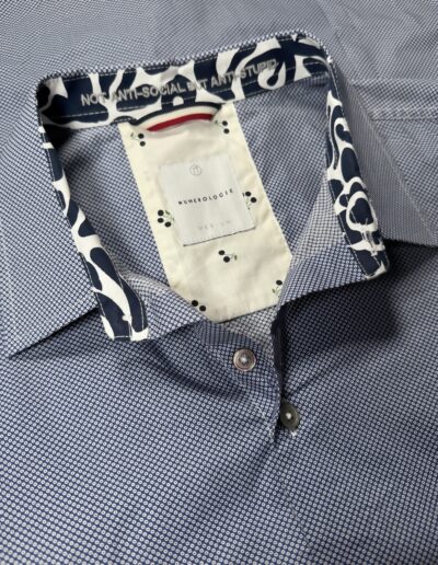 Chemise à motif graphique marine et blanc – coton doux, broderie grise claire « Le vin d’ici vaut mieux que l’eau de là », coupe ajustée. Numérotation unique