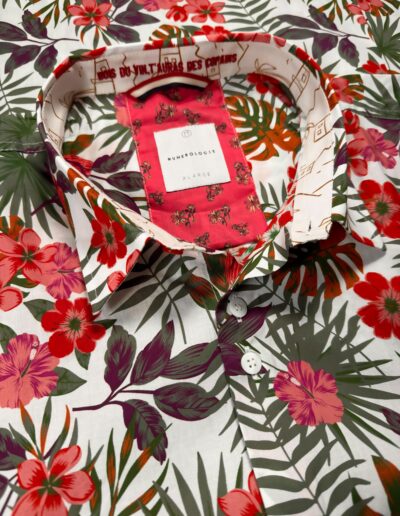 Chemise manches courtes à motif floral multicolor sur fond blanc– coton doux, broderie rouge » Bois du vin, t’auras des copains « , coupe ajustée. Numérotation unique