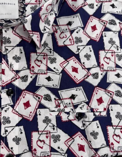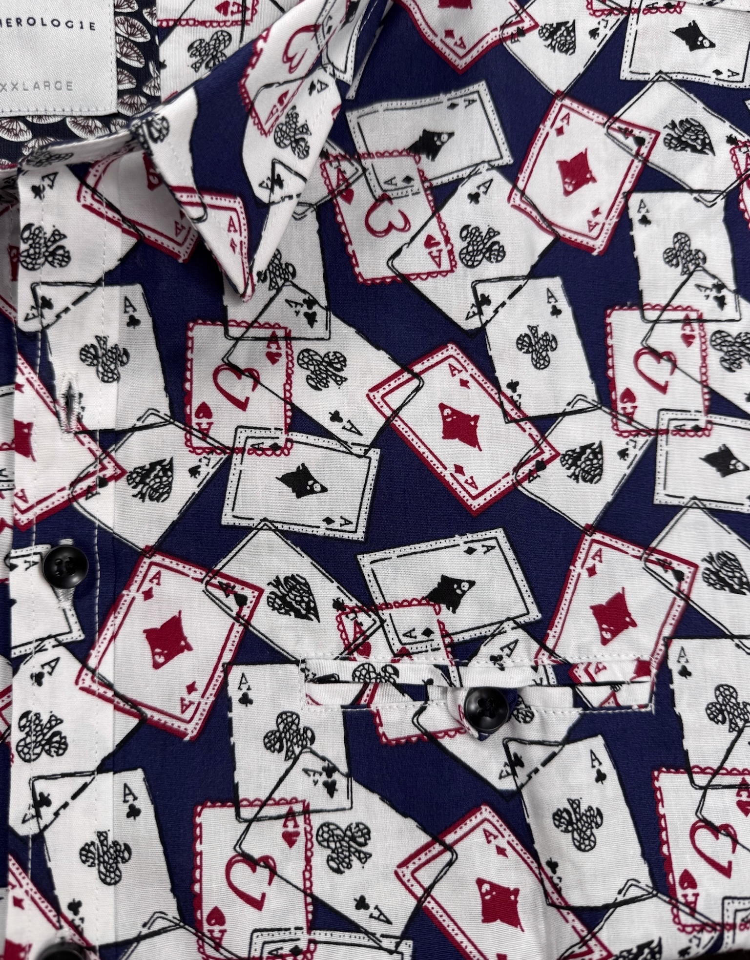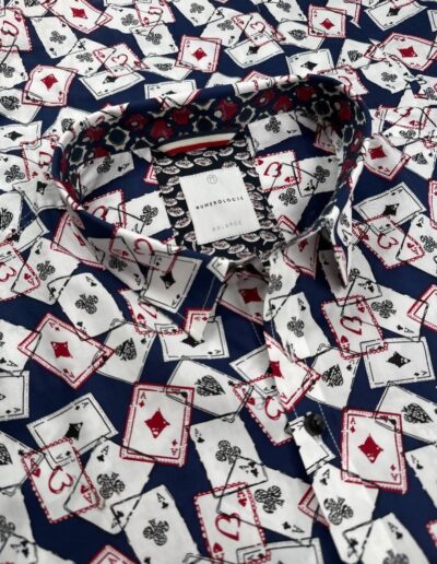 Chemise imprimé jeux de cartes sur fond marine – coton doux,coupe ajustée. Numérotation unique