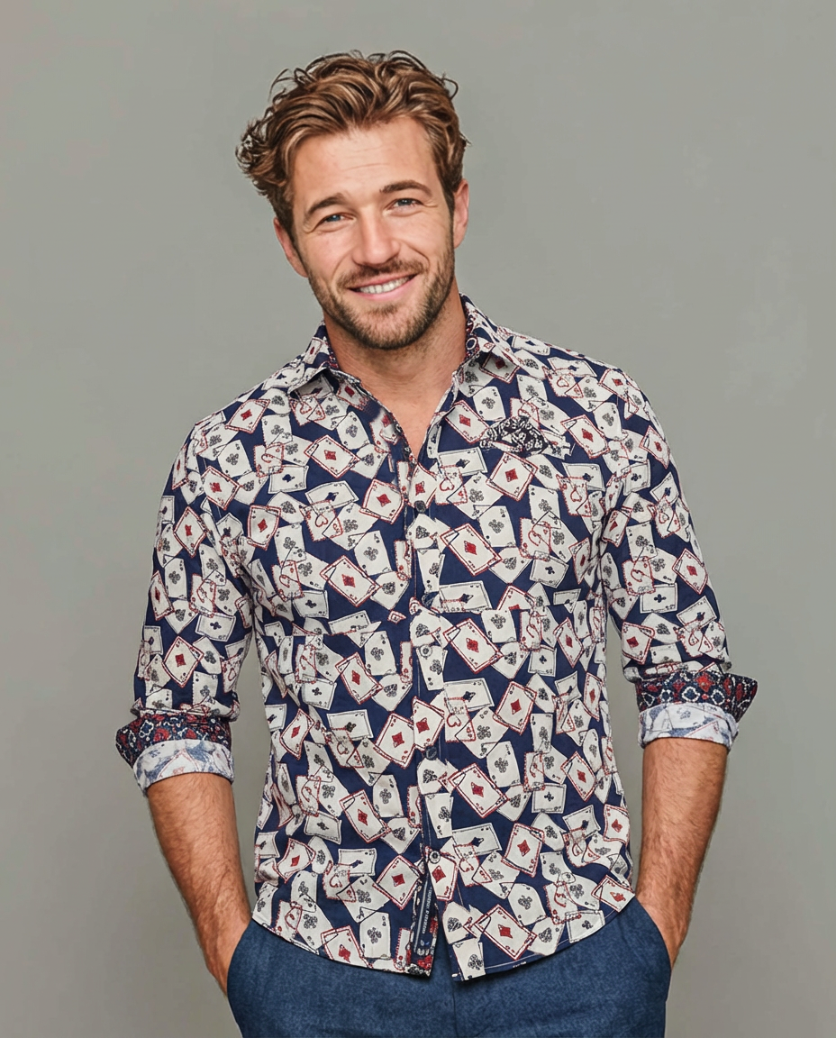 Une chemise à motif imprimé cartes de jeux sur fond marine, pensée pour un style qui allie confort et sophistication.