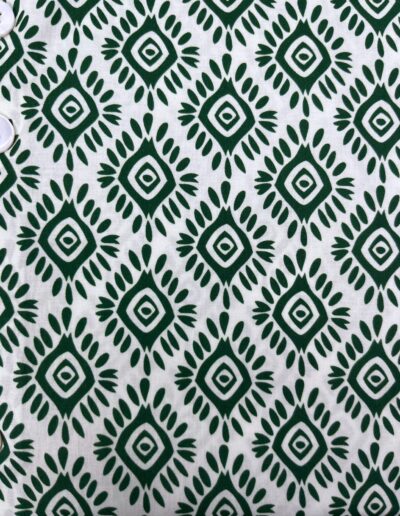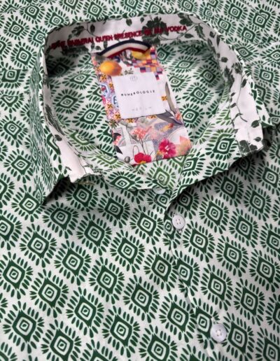 Une chemise à motif graphique vert sur fond écru, pensée pour un style qui allie confort et sophistication.