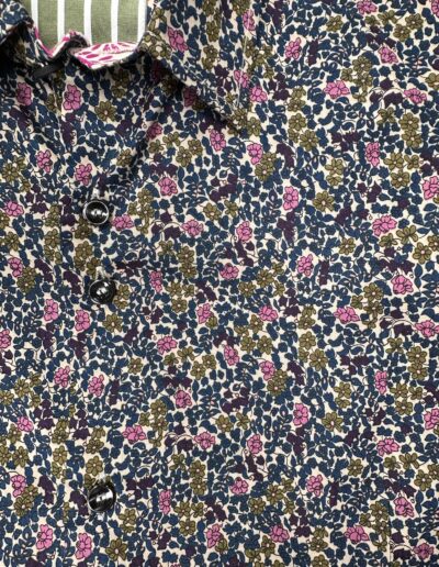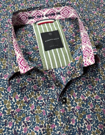 Chemise à motif floral multicolore sur fond écru – coton doux, broderie marine « Bref, on a qu’une vie « , coupe ajustée. Numérotation unique