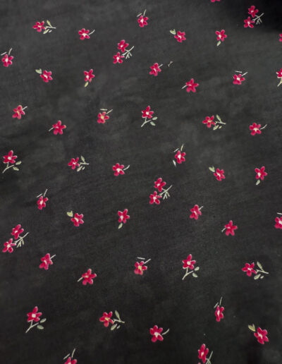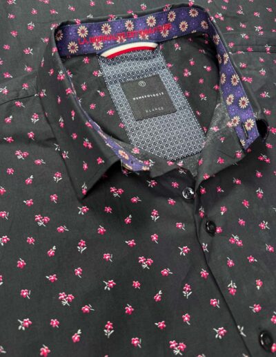 Une chemise à motif floral délicat rouge sur un fond noir, pensée pour un style qui allie confort et sophistication.