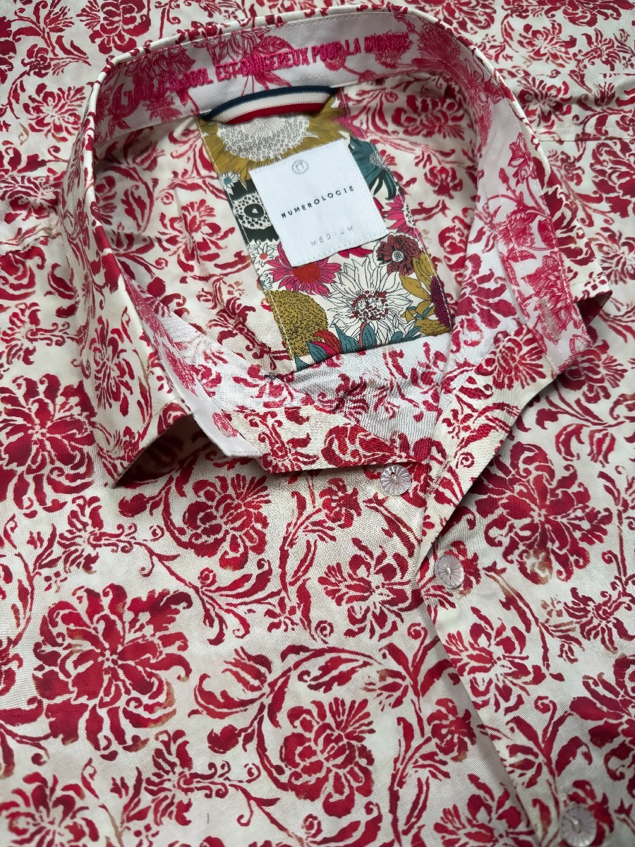 Chemise à motif floral rouge sur fond écru – coton doux, broderie fuchsia « L’abus d’alcool est dangereux pour la dignité », coupe ajustée. Numérotation unique
