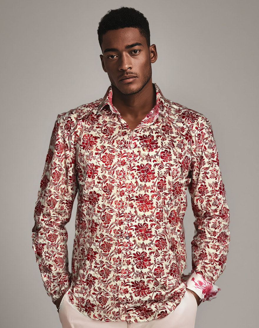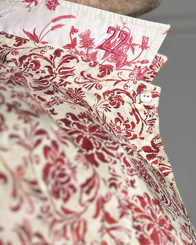 Une chemise à motif floral rouge sur fond écru, pensée pour un style qui allie confort et sophistication.