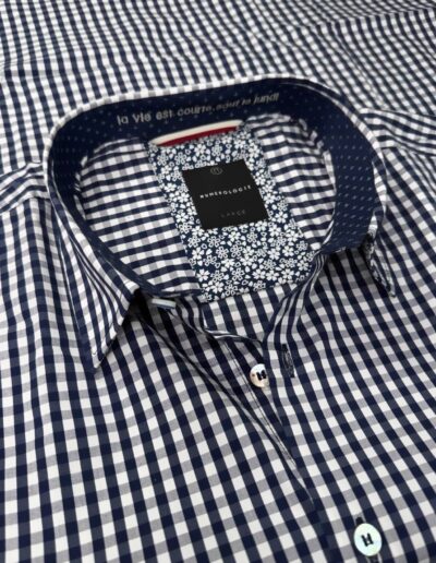 Chemise à motif à carreaux marine et écru – coton doux, broderie grise « La vie est courte, sauf le lundi « , coupe ajustée. Numérotation unique