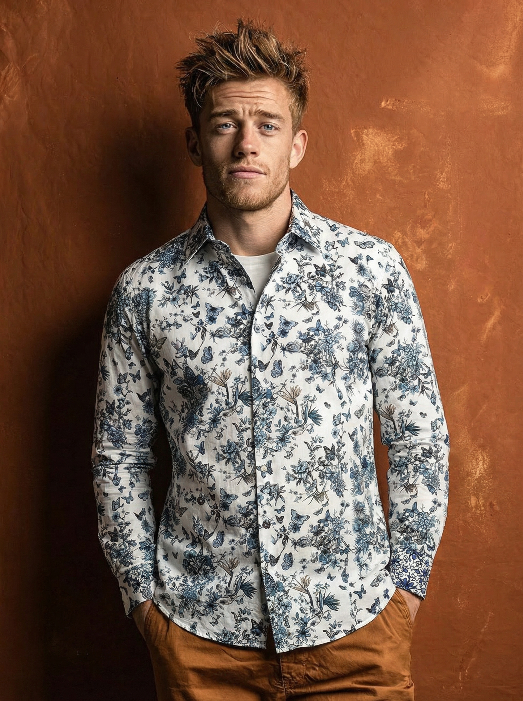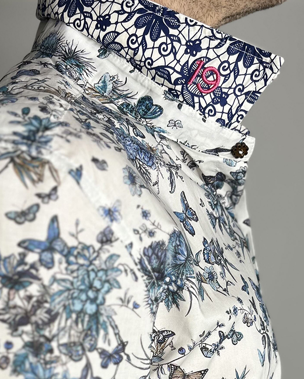Une chemise à motif floral BLEU sur fond écru, pensée pour un style qui allie confort et sophistication.