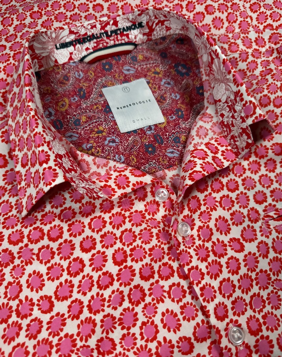 Une chemise à motif floral rose sur fond blanc, pensée pour un style qui allie confort et sophistication.