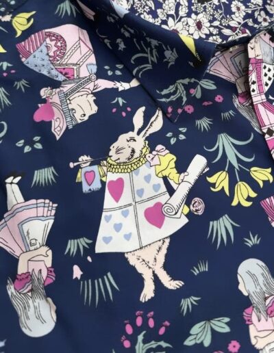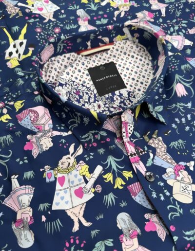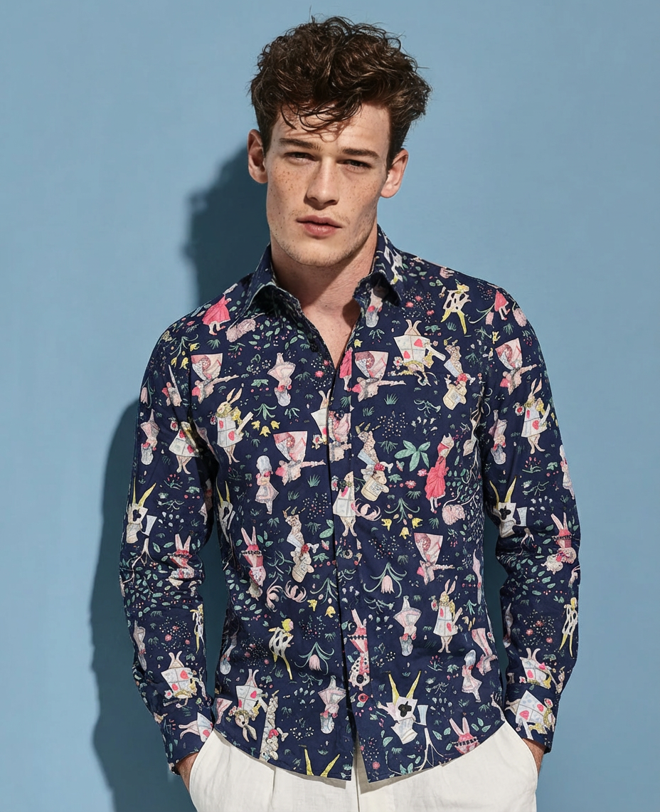 Une chemise imprimée Alice au pays des merveilles sur fond marine, pensée pour un style qui allie confort et sophistication.