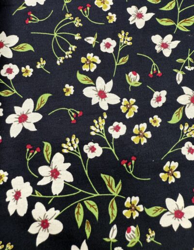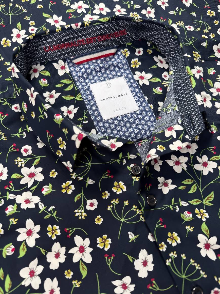 Une chemise à motif floral délicat écru et vert sur un fond bleu marine, pensée pour un style qui allie confort et sophistication.