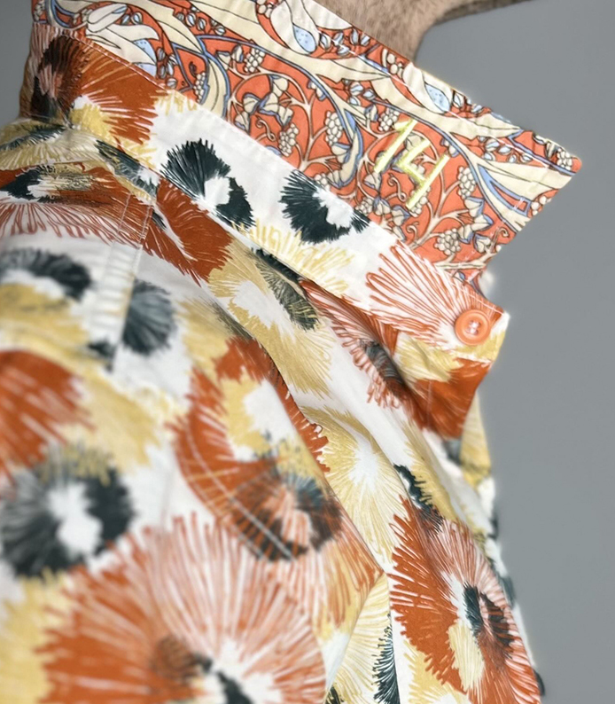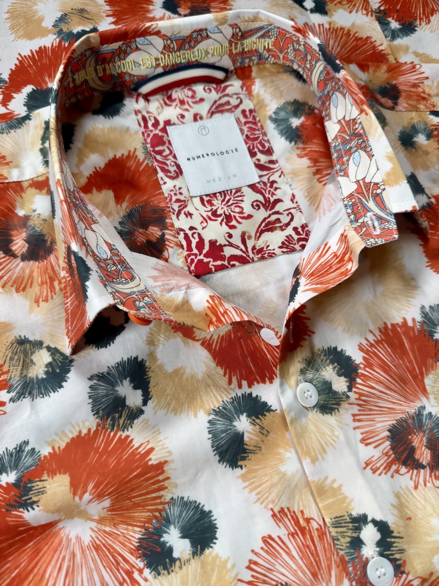 Chemise à motif floral sur fond écru – coton doux, broderie jaune « L’abus d’alcool est dangereux pour la dignité », coupe ajustée. Numérotation unique