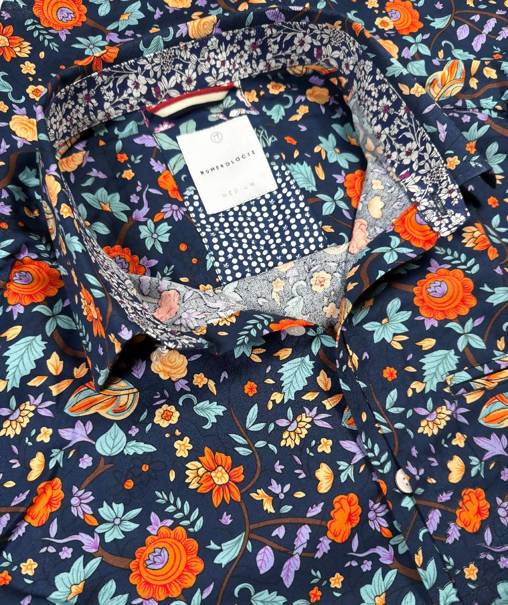 Chemise à motif floral multicolore sur fond marine – coton doux, coupe ajustée. Numérotation unique
