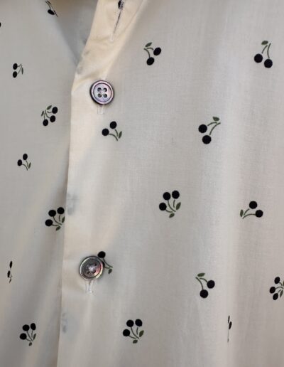 Une chemise à motif cerises marines et vertes sur fond écru, pensée pour un style qui allie confort et sophistication.