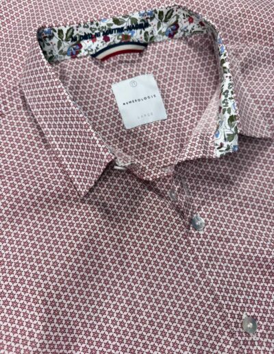 Chemise Léonard à motifs graphiques rouges sur fond blanc – coton doux, broderie marine « Ni dieux, Ni maître-nageur », coupe légèrement ajustée. Numérotation unique.