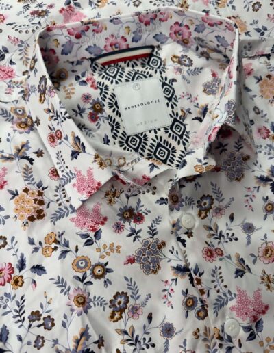 Une chemise à motif floral mukticolore sur un fond écru, pensée pour un style qui allie confort et sophistication.