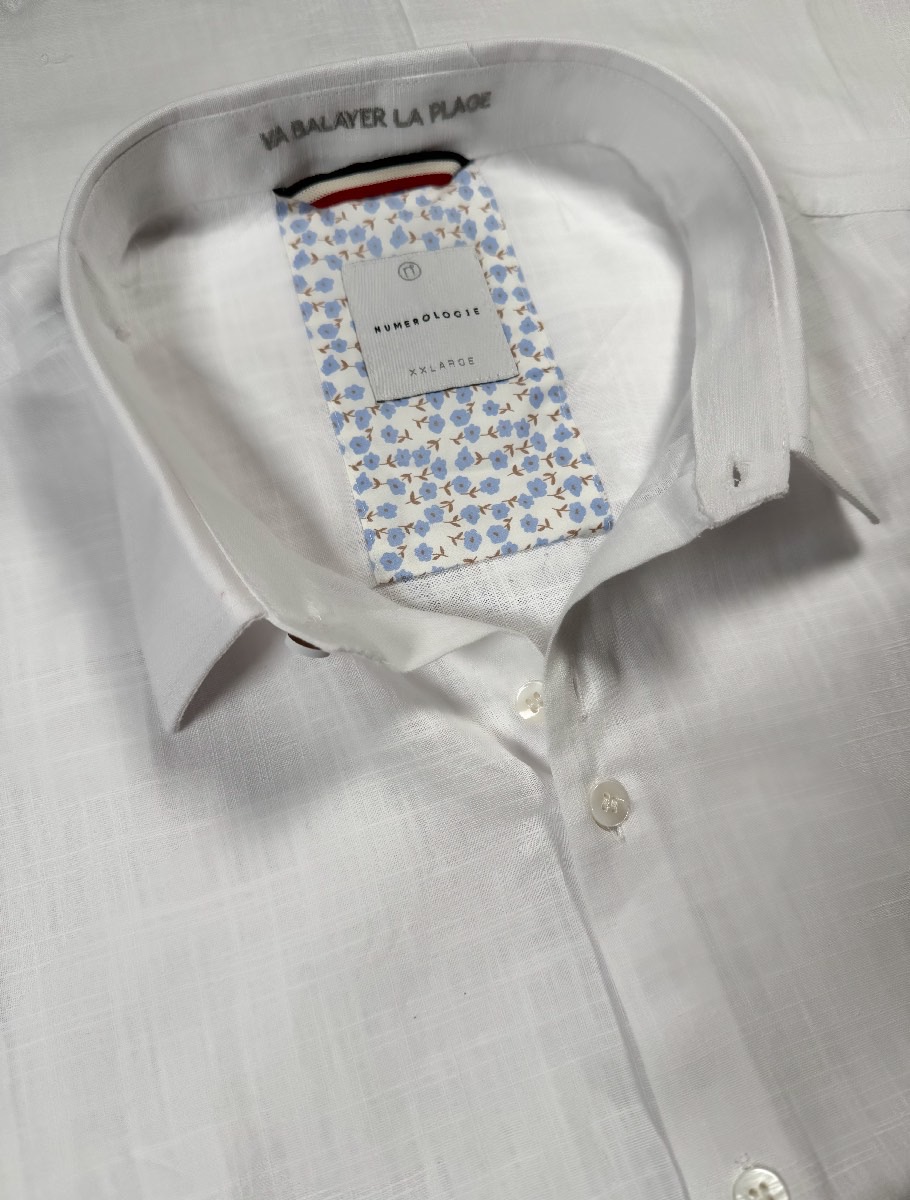 Chemise blanche unie – coton doux, broderie grise claire « Va balayer la plage », coupe ajustée. Numérotation unique.