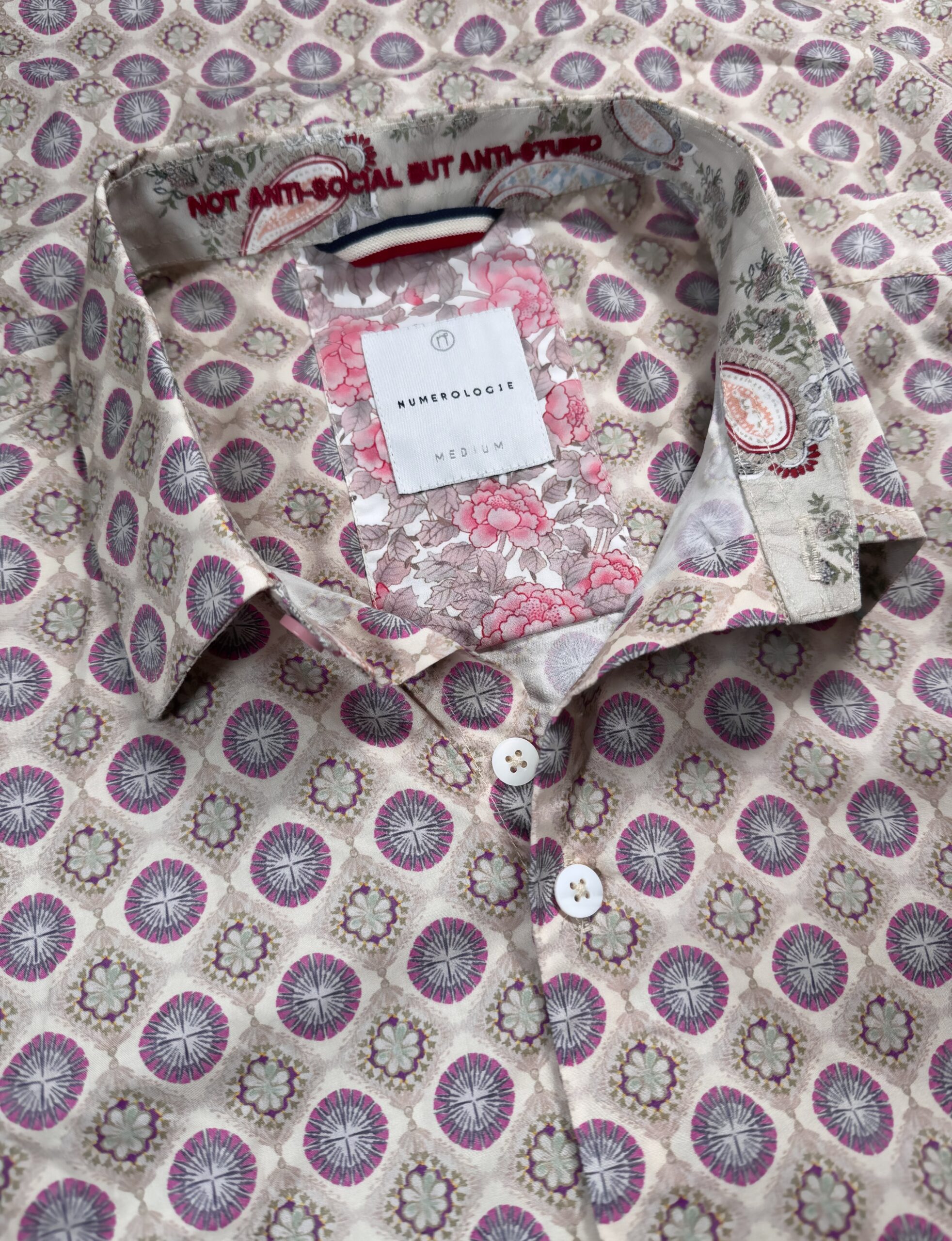 Chemise à motif graphique sur fond beige– coton doux, broderie rouge « NOT ANTI-SOCIAL BUT ANTI-STUPID », coupe ajustée. Numérotation unique