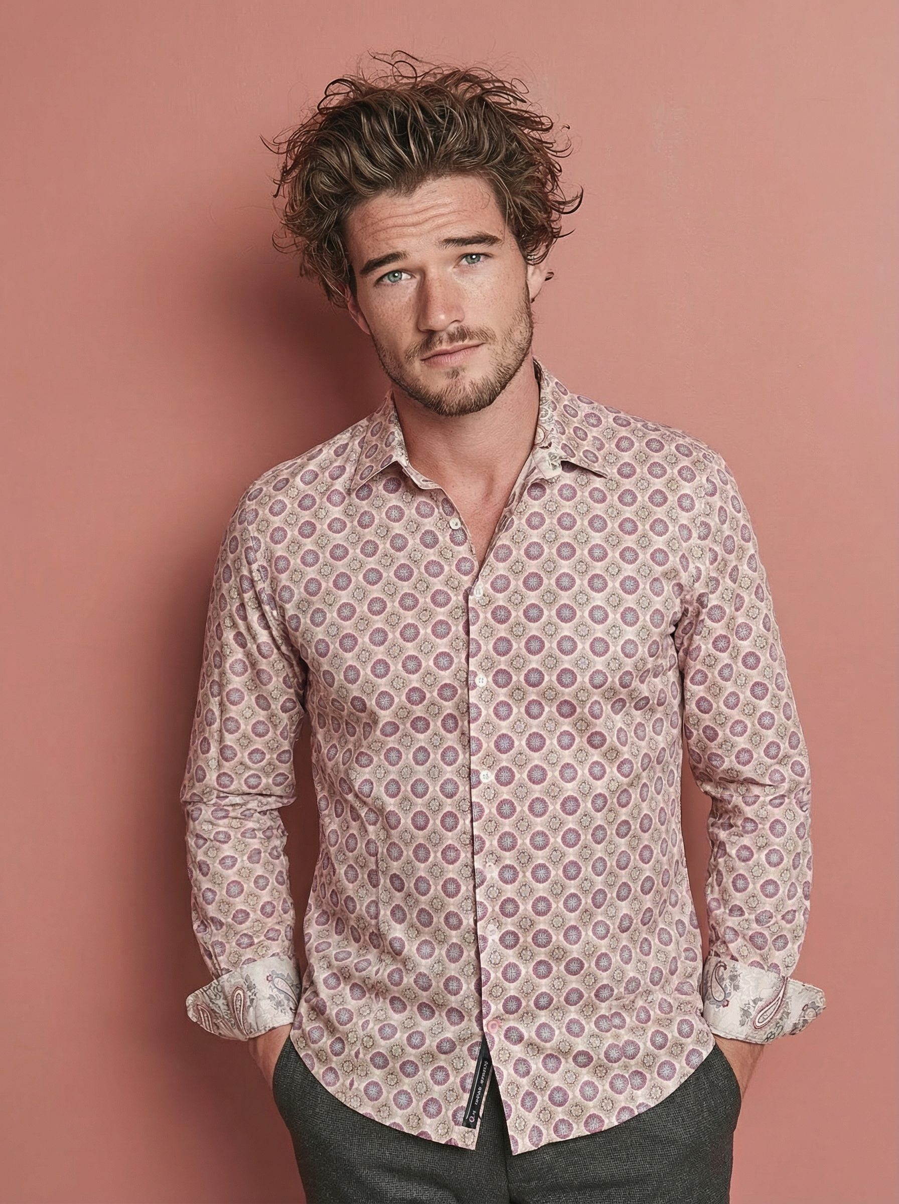 Une chemise à motif graphique sur fond beige, pensée pour un style qui allie confort et sophistication.