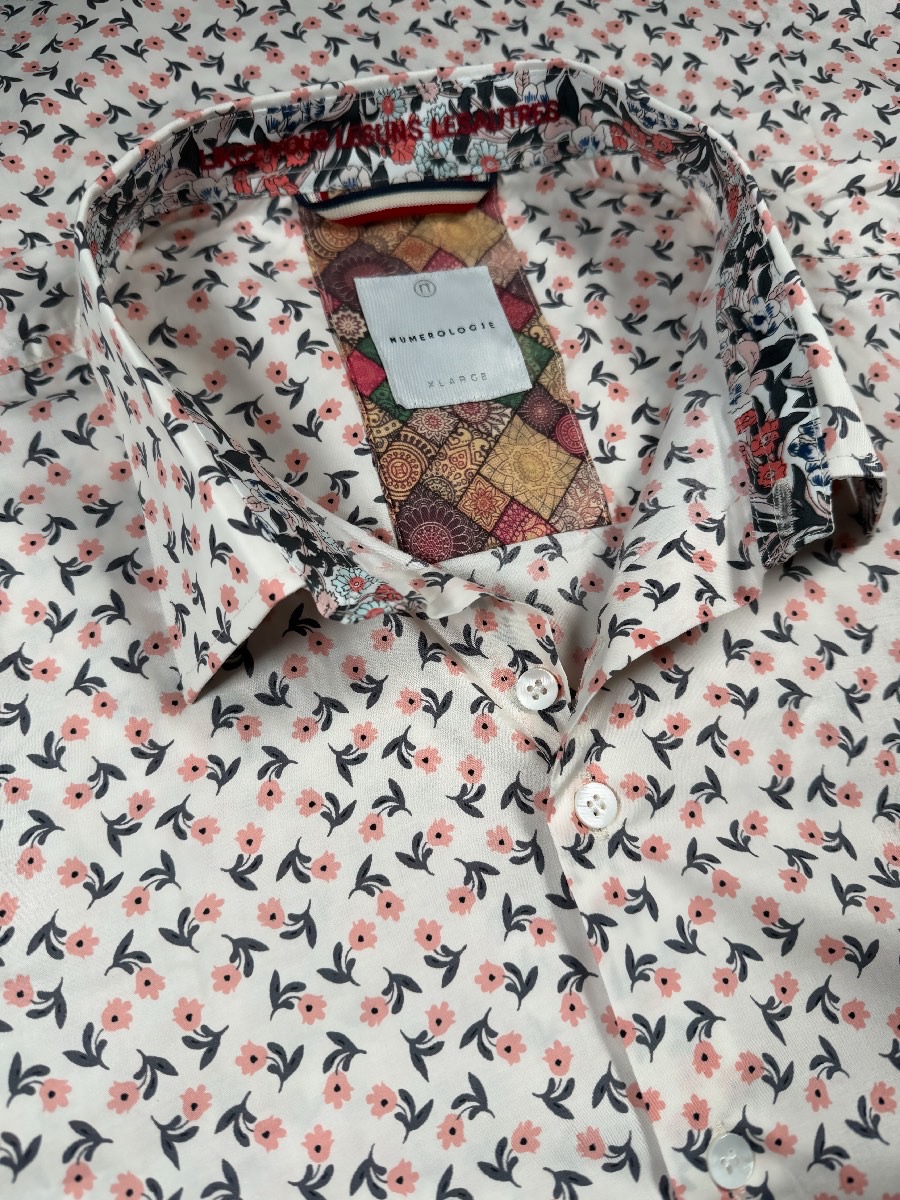 Chemise à motif floral rose sur fond écru – coton doux, broderie rouge  » LIKEZ-VOUS LES UNS LES AUTRES « , coupe ajustée. Numérotation unique