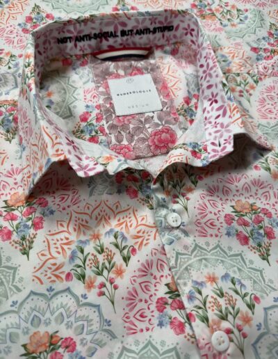 Chemise à motif floral multicolor sur fond écru– coton doux, broderie marine » NOT ANTI-SOCIAL BUT ANTI-STUPID « , coupe ajustée. Numérotation unique