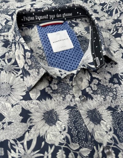 Une chemise à motif floral délicat sur un fond bleu, pensée pour un style qui allie confort et sophistication.