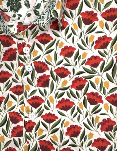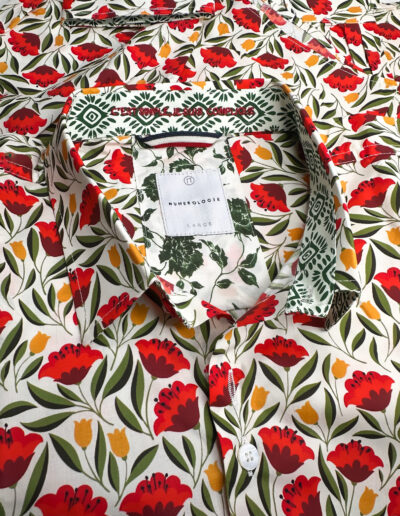 Chemise à motif floral sur fond écru – coton doux, broderie rouge « C’est simple, je suis compliqué », coupe ajustée. Numérotation unique