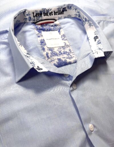 Le col français, subtil et intemporel, complète parfaitement cette chemise.
