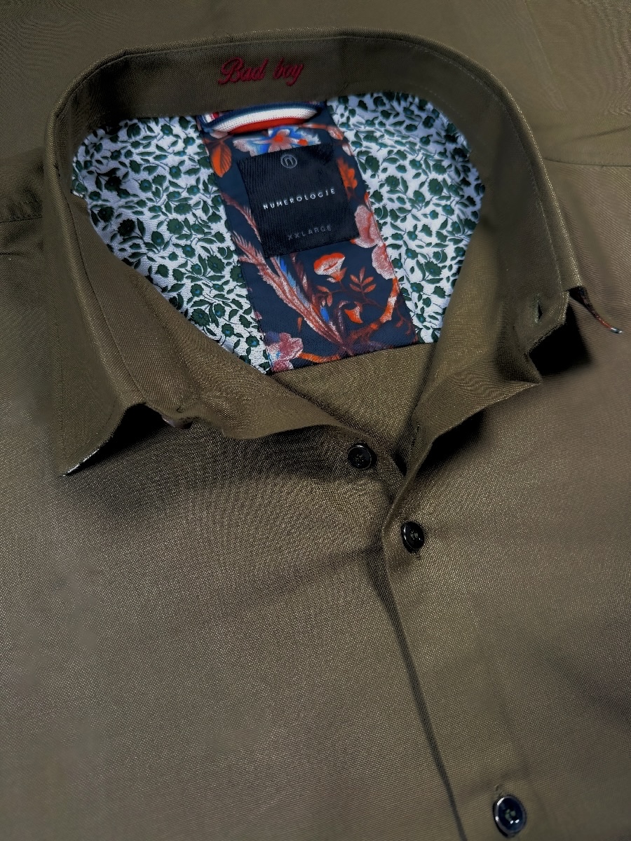 Chemise kaki unie – coton doux, broderie rouge « Bad boy », coupe ajustée. Numérotation unique.