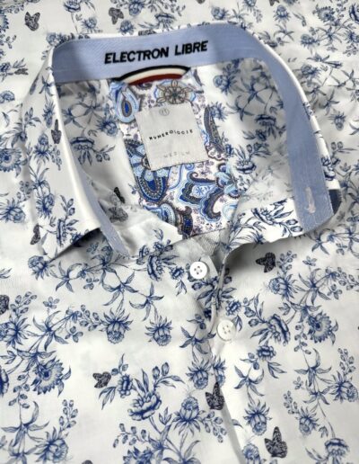 Chemise florale beige et bleu foncé – coton doux, broderie grise « Electron libre », coupe ajustée. Numérotation unique.