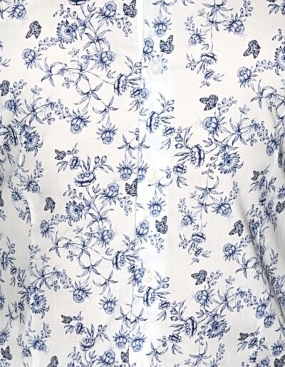 Une chemise à motif floral bleu foncé sur un fond beige, pensée pour un style qui allie confort et sophistication.