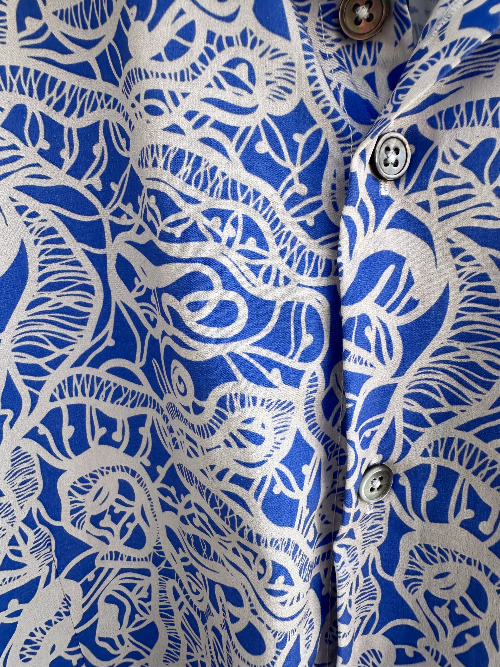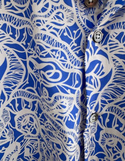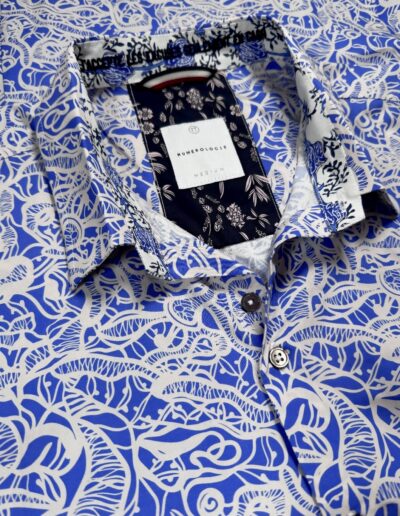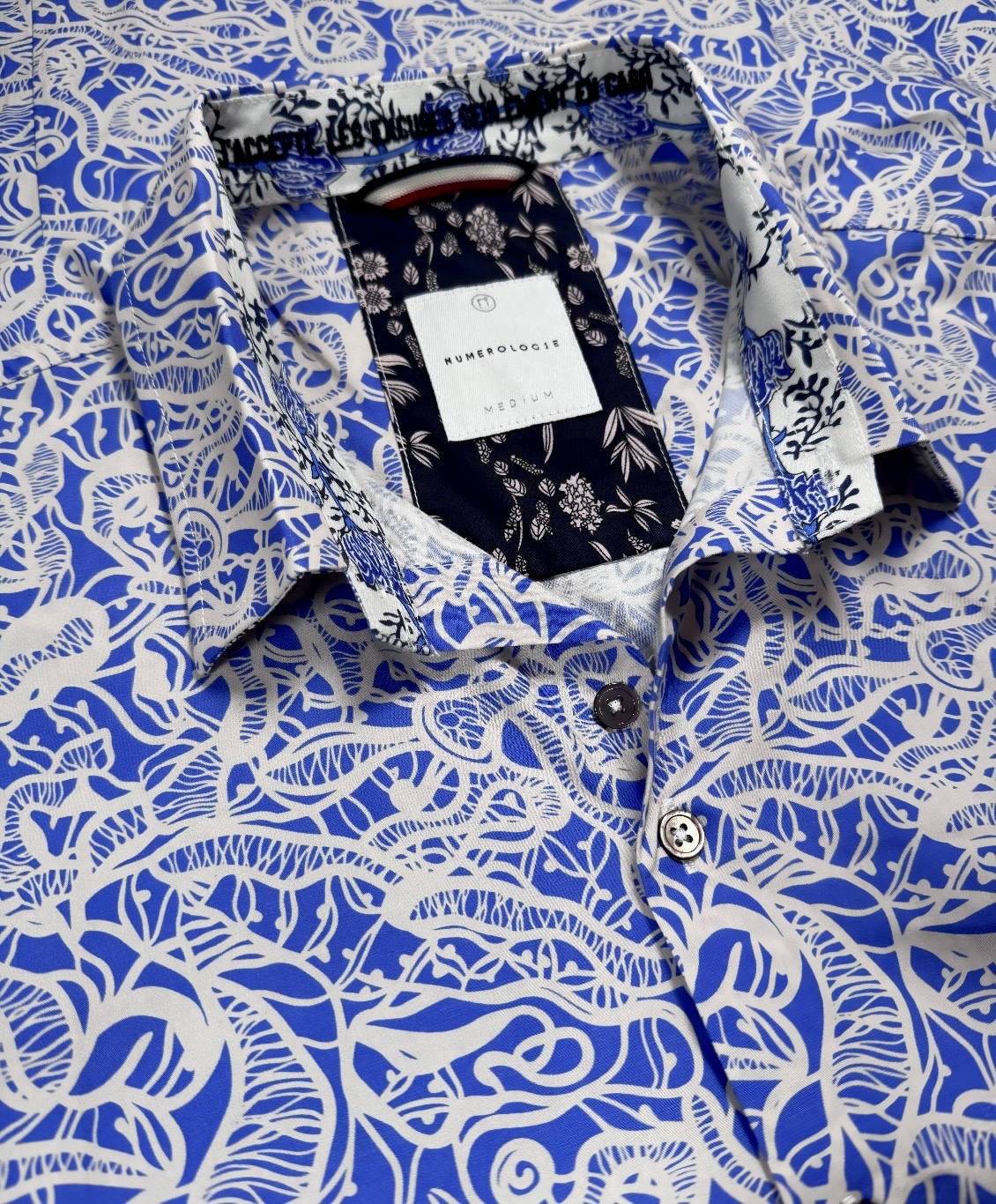 Une chemise à motif graphique écru sur fond bleu, pensée pour un style qui allie confort et sophistication.