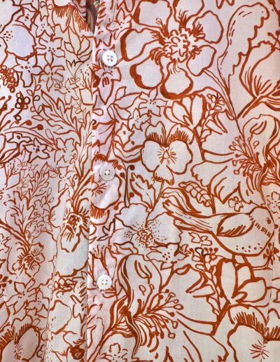 Chemise à motif floral orange sur fond écru – coton doux, broderie marine « Bois du vin, t’auras des copains », coupe ajustée. Numérotation unique