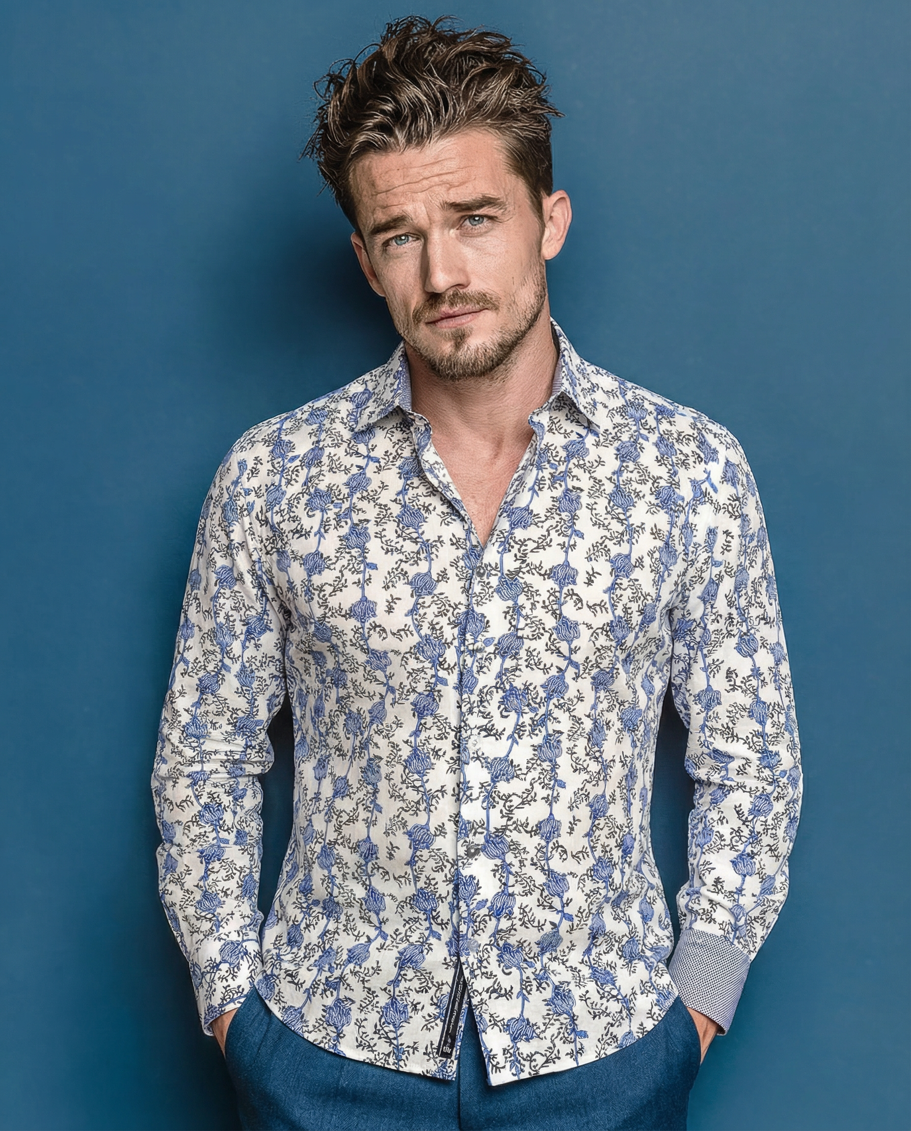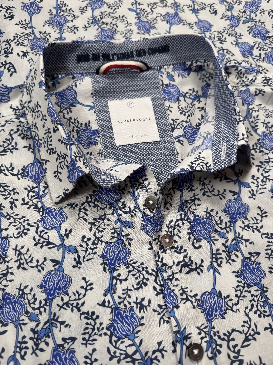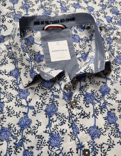 Une chemise à motif floral bleu sur fond écru, pensée pour un style qui allie confort et sophistication.