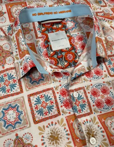 Chemise à motif graphique multicolore sur fond écru – coton doux, broderie orange « No girlfriend no migraine », coupe ajustée. Numérotation unique