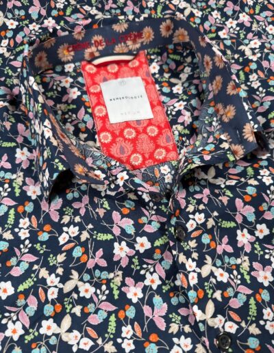 Chemise à motif floral multicolore sur fond marine – coton doux, broderie rouge « Crème de la crème », coupe ajustée. Numérotation unique