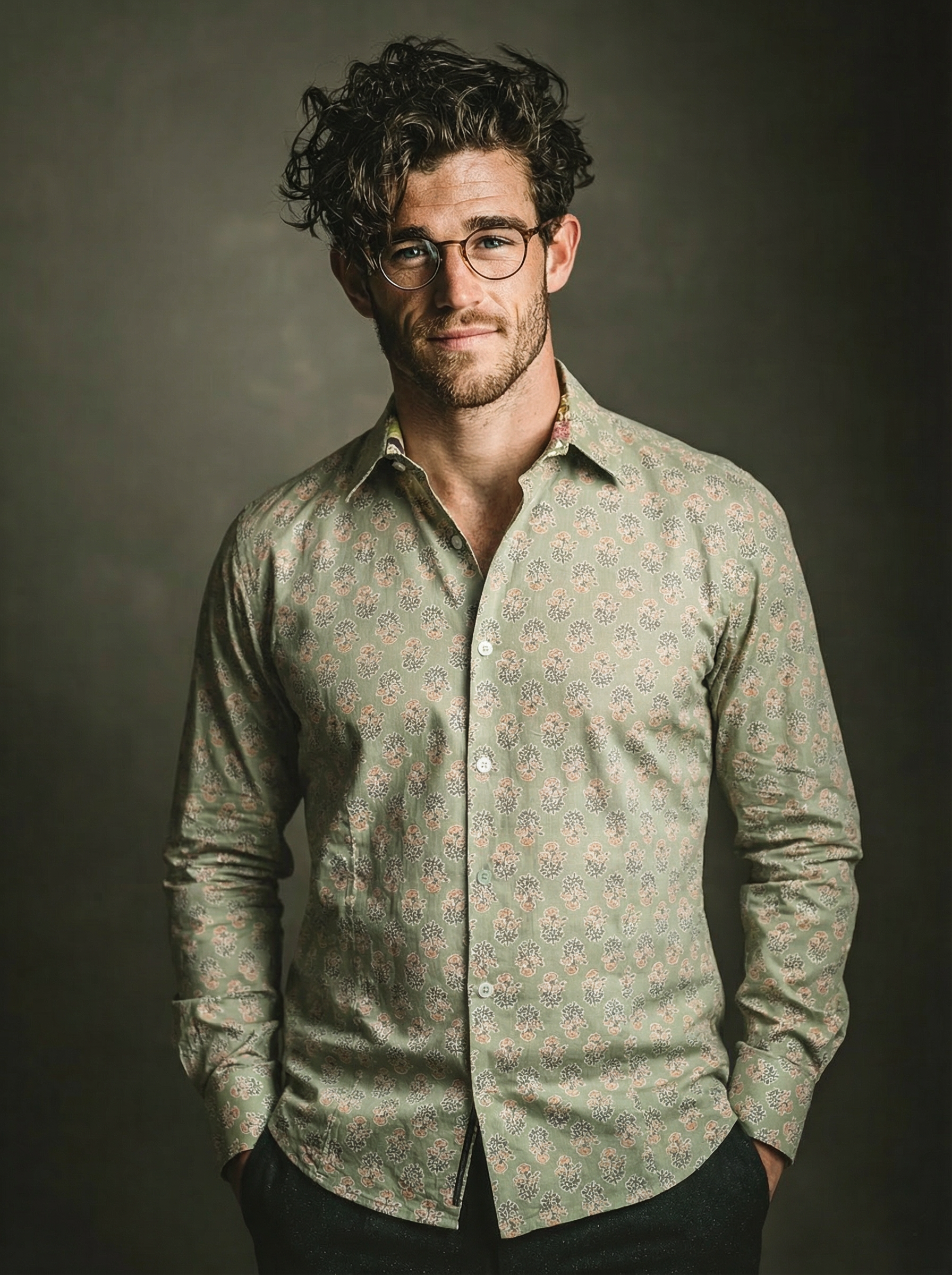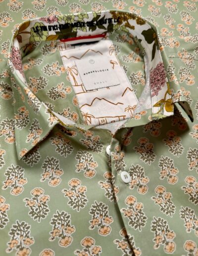 Une chemise à motif floral multicolor sur fond vert clair, pensée pour un style qui allie confort et sophistication.