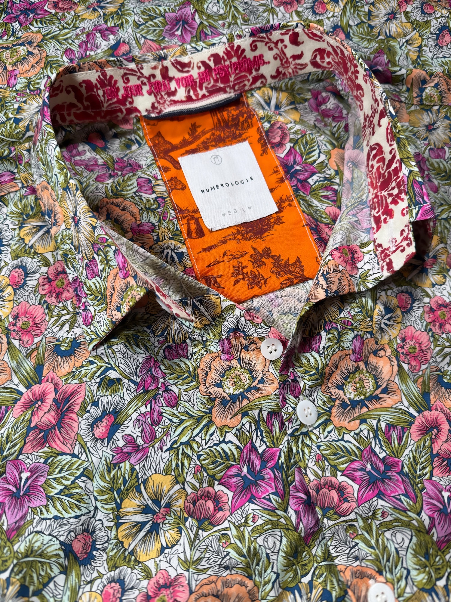 Chemise à motif floral multicolore – coton doux, broderie fuchsia « Un jour j’irai voir un psy, promis.. « , coupe ajustée. Numérotation unique