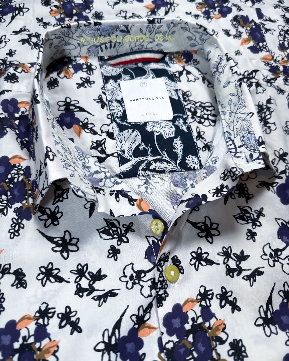 Chemise à motif floral multicolor sur fond écru– coton doux, broderie jaune » JE SUIS POLI, BORDEL DE M…. « , coupe ajustée. Numérotation unique