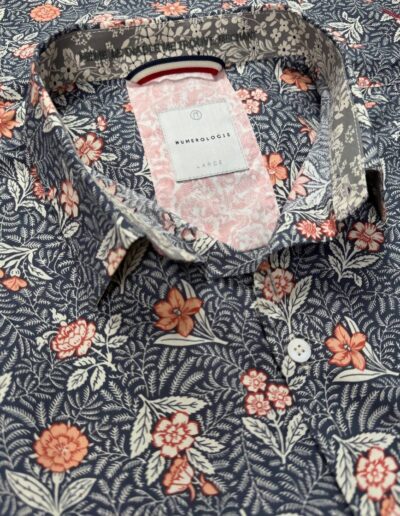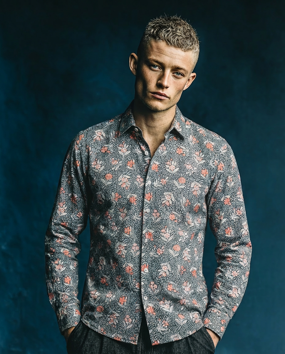 Une chemise à motif floral délicat écru et rose sur un fond bleu acier, pensée pour un style qui allie confort et sophistication.